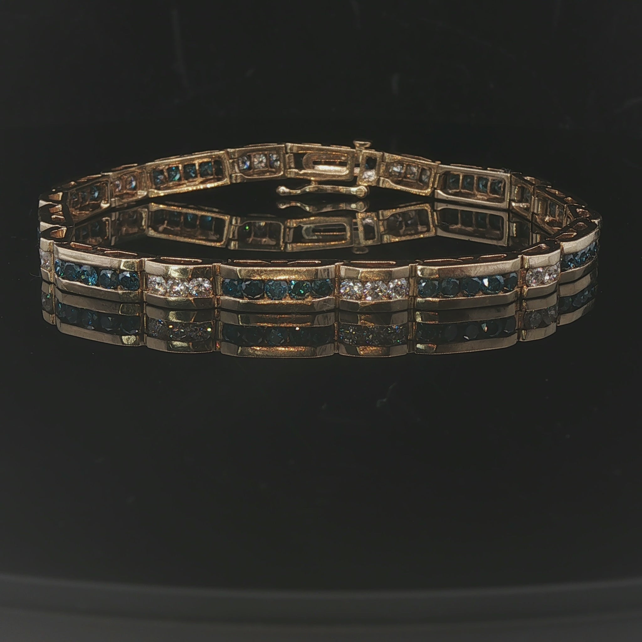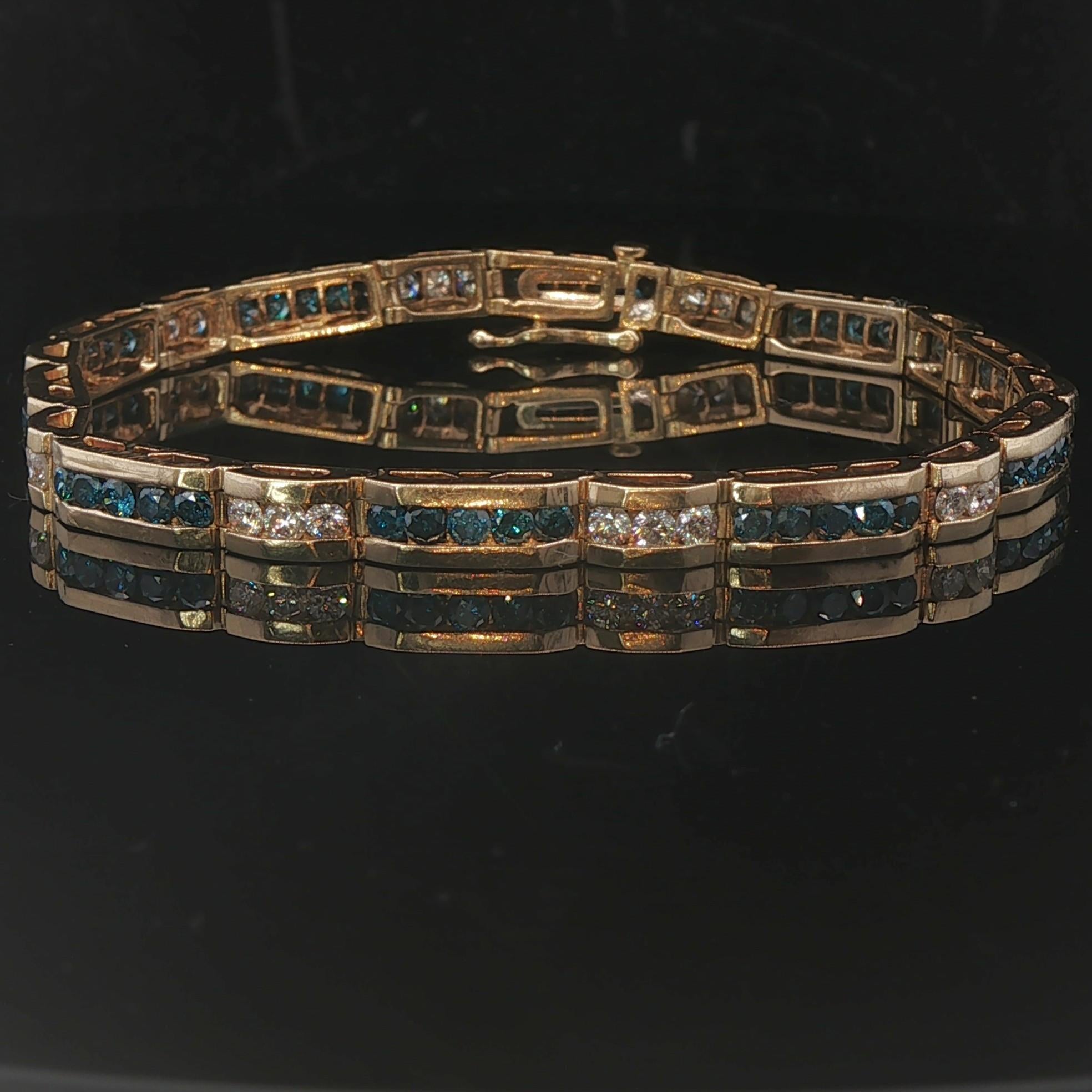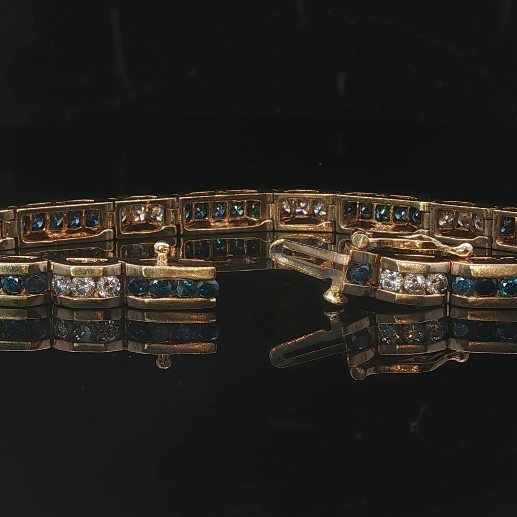 14k Yellow Gold and 4.5cttw Blue and White Diamond Bar Link Bracelet 7.25"