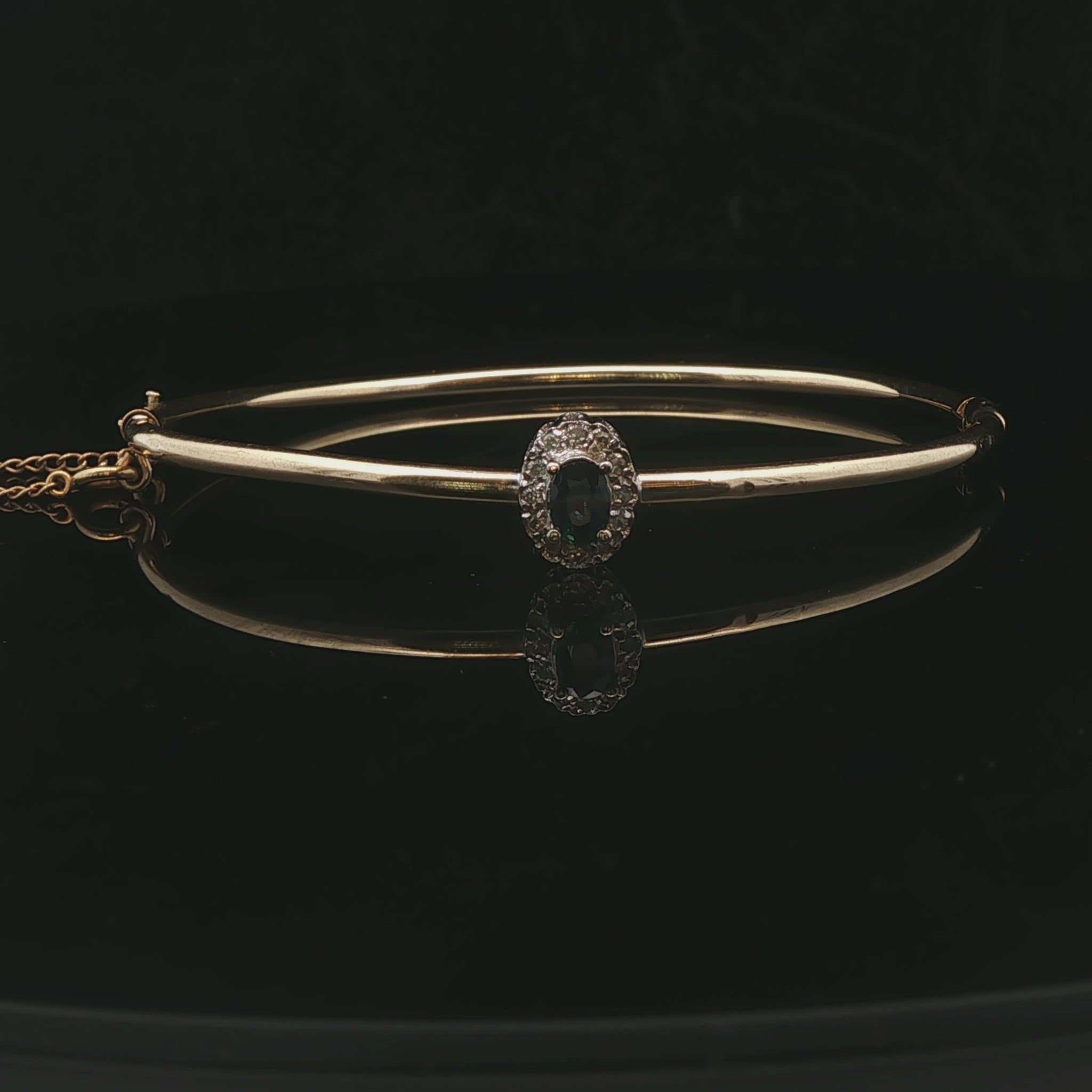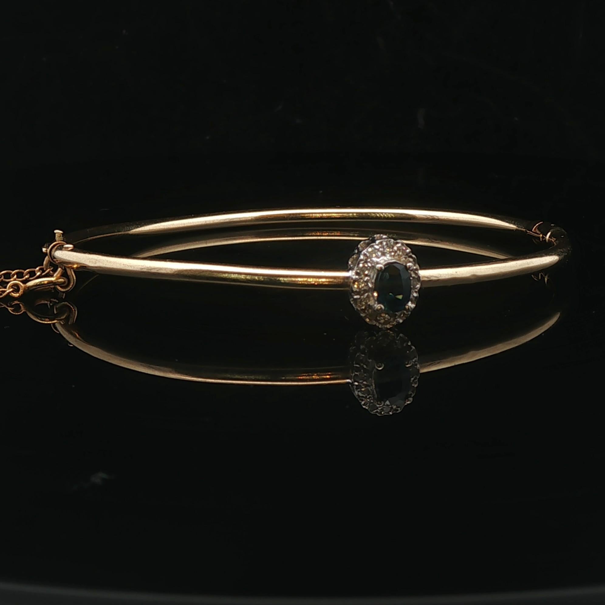 14k Yellow Gold Blue Sapphire and Diamond Halo Bangle Bracelet 6.75"
