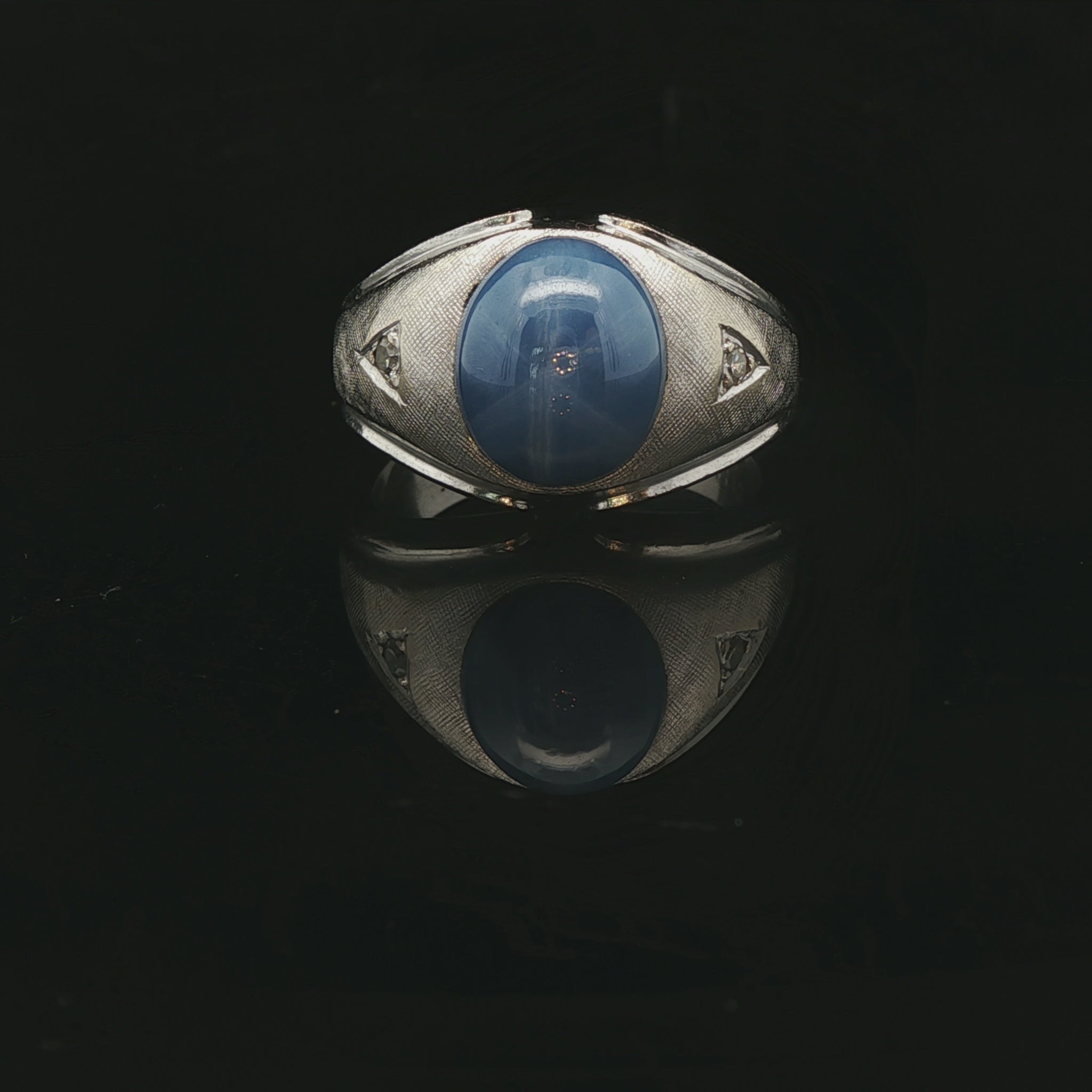 14k White Gold Blue Star Sapphire and Diamond Men's Ring Size