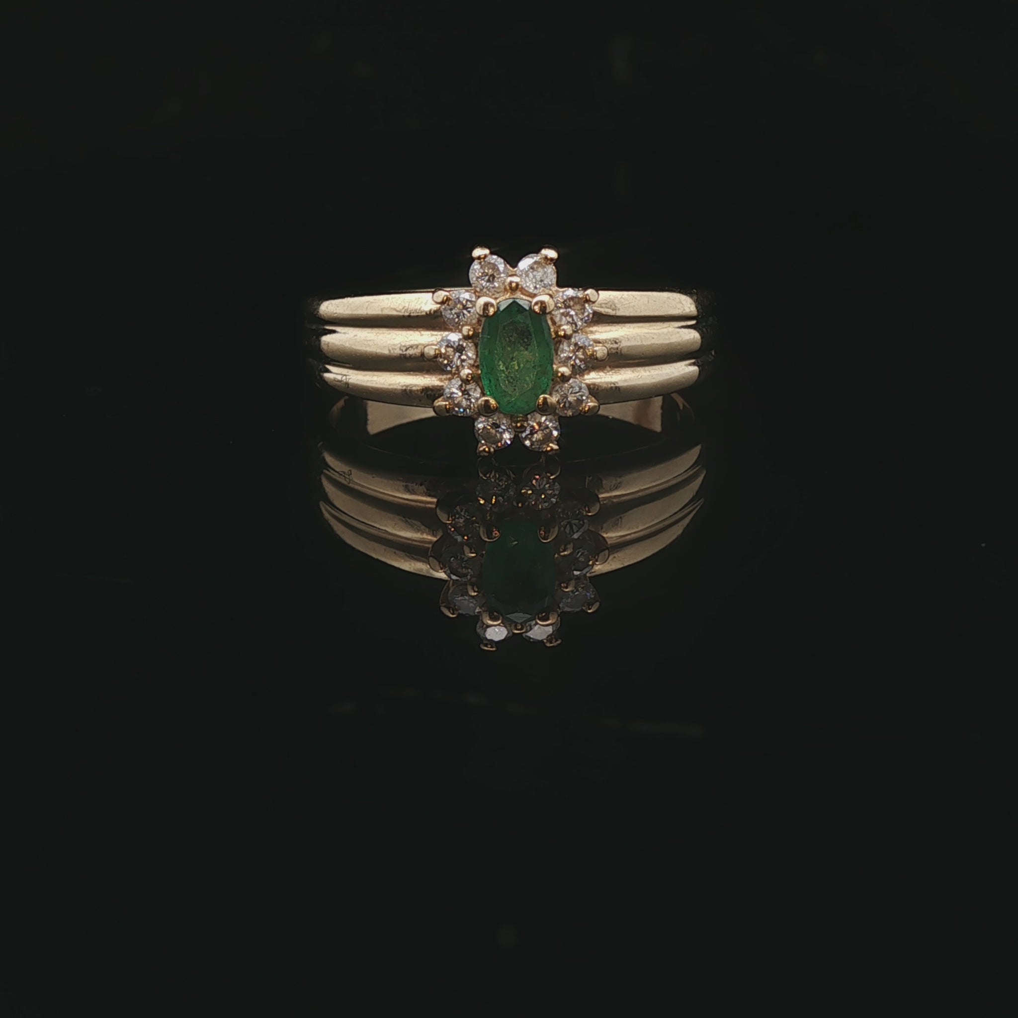 14k Yellow Gold Emerald and Diamond Halo Ladies Ring Size 6.25