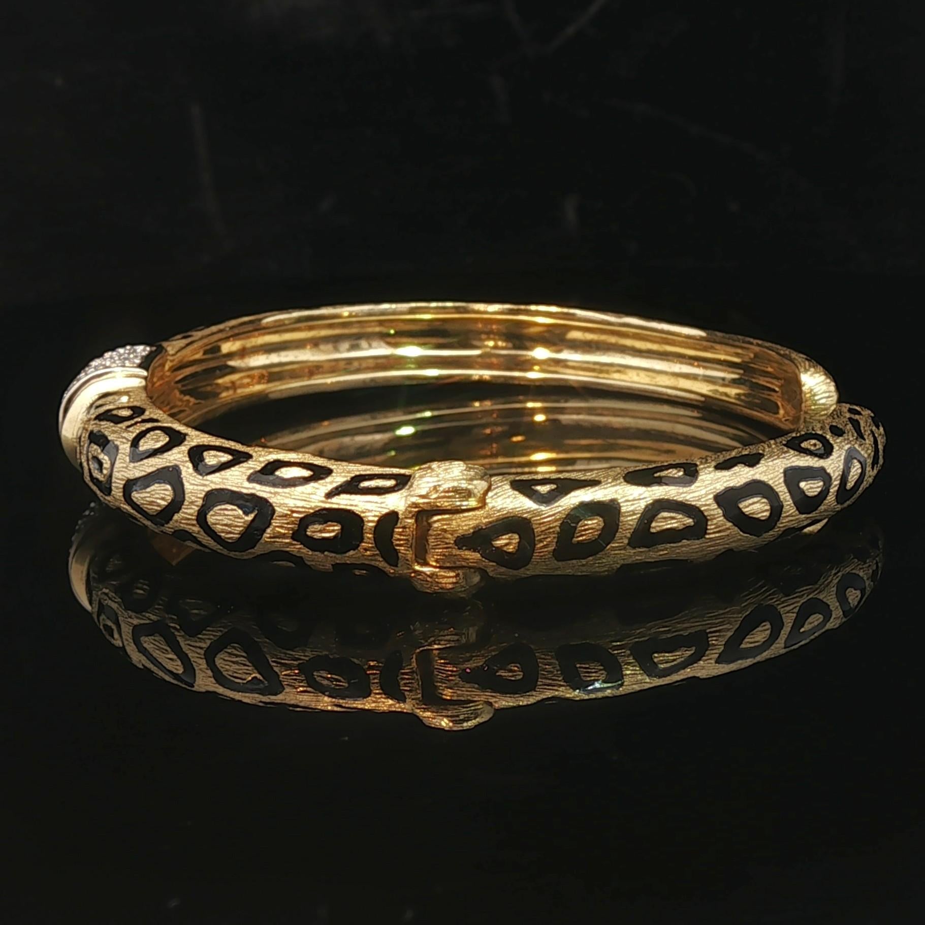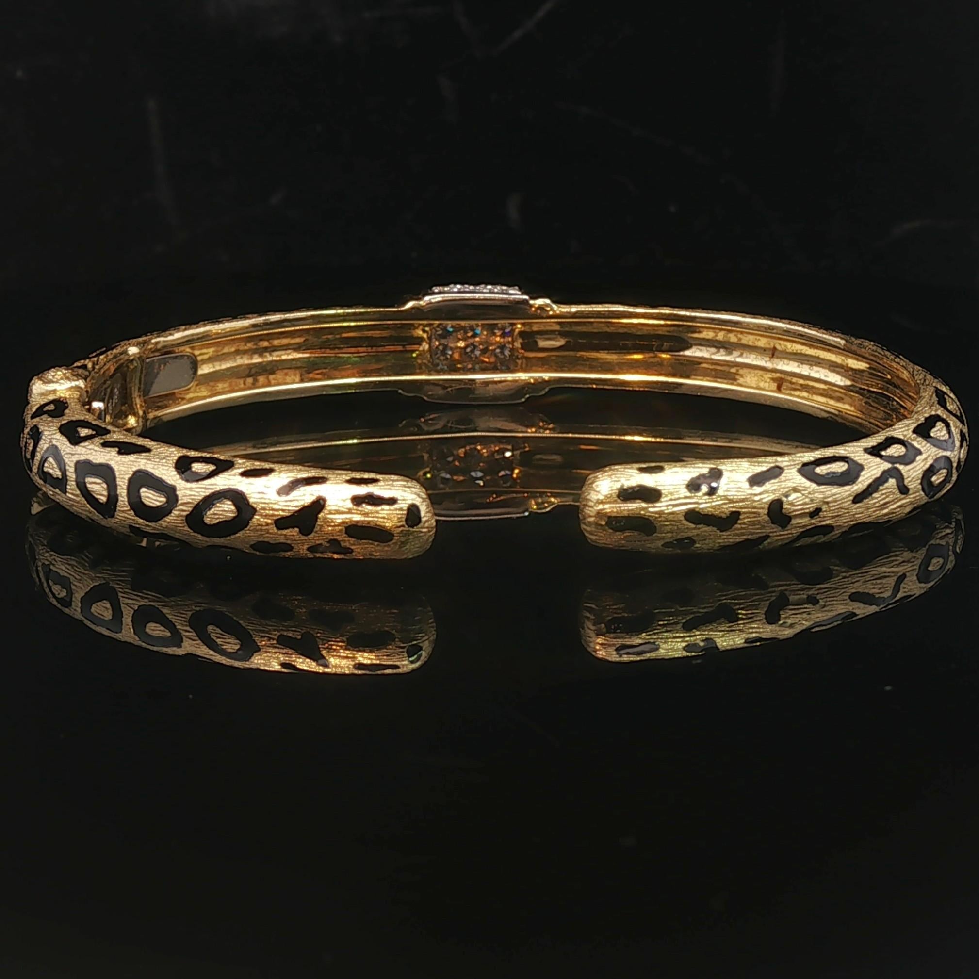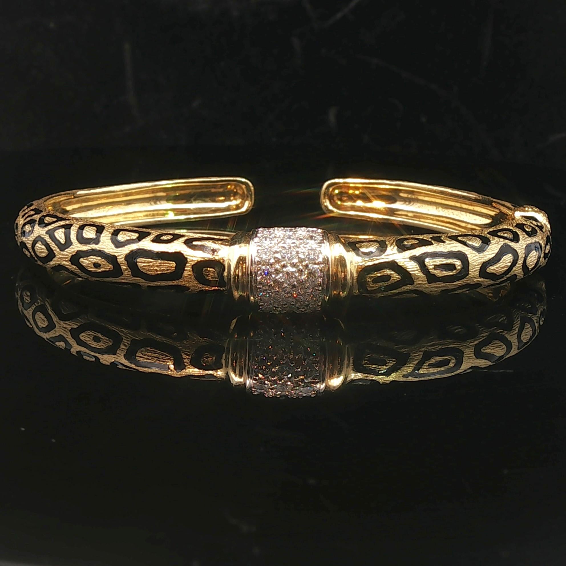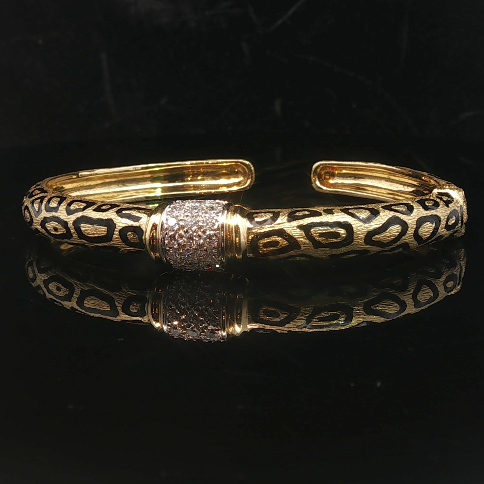 18k Yellow Gold and Diamond 32g Solid Heavy Enamel Leopard Print Cuff Bracelet
