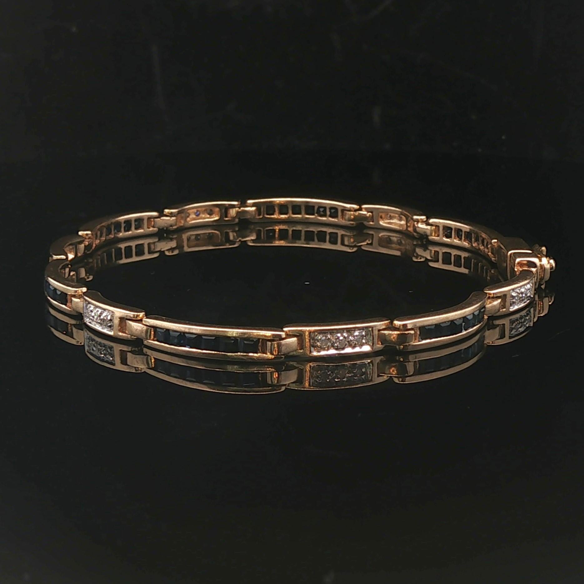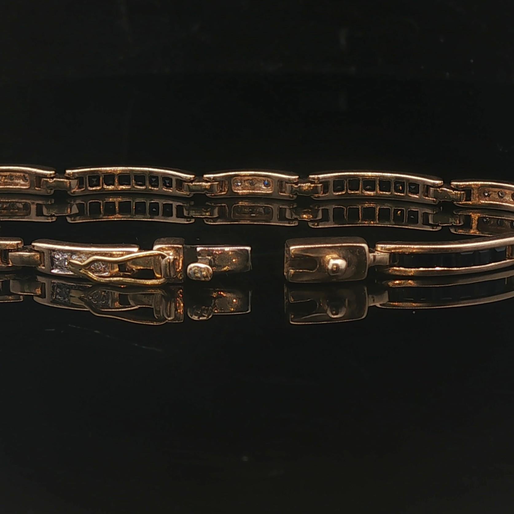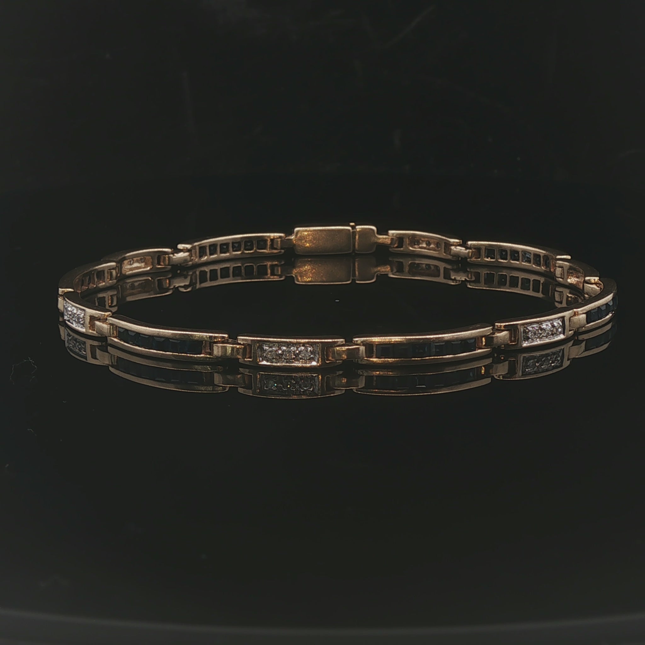14k Yellow Gold Blue Sapphire and Diamond 10.5g Vintage Bar Link Bracelet 7.25"