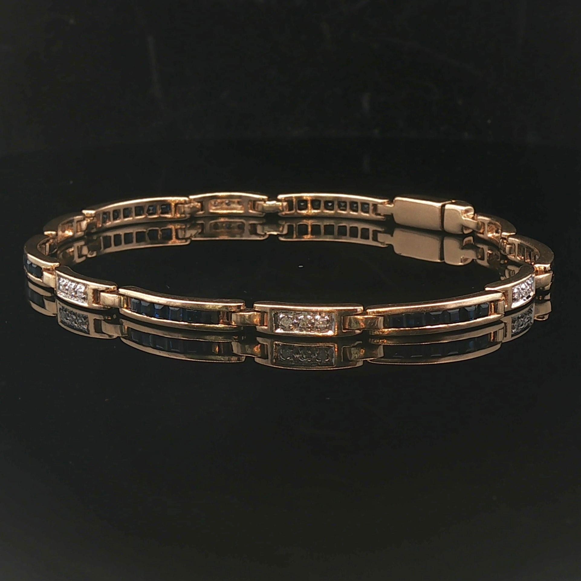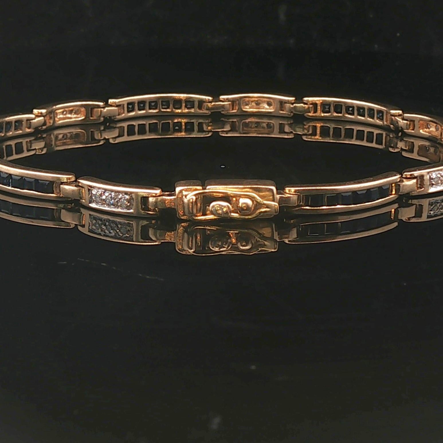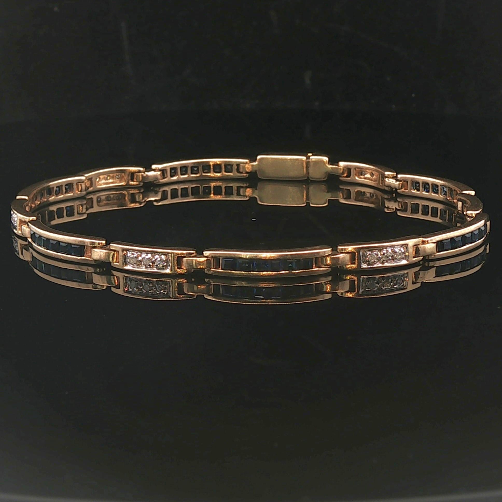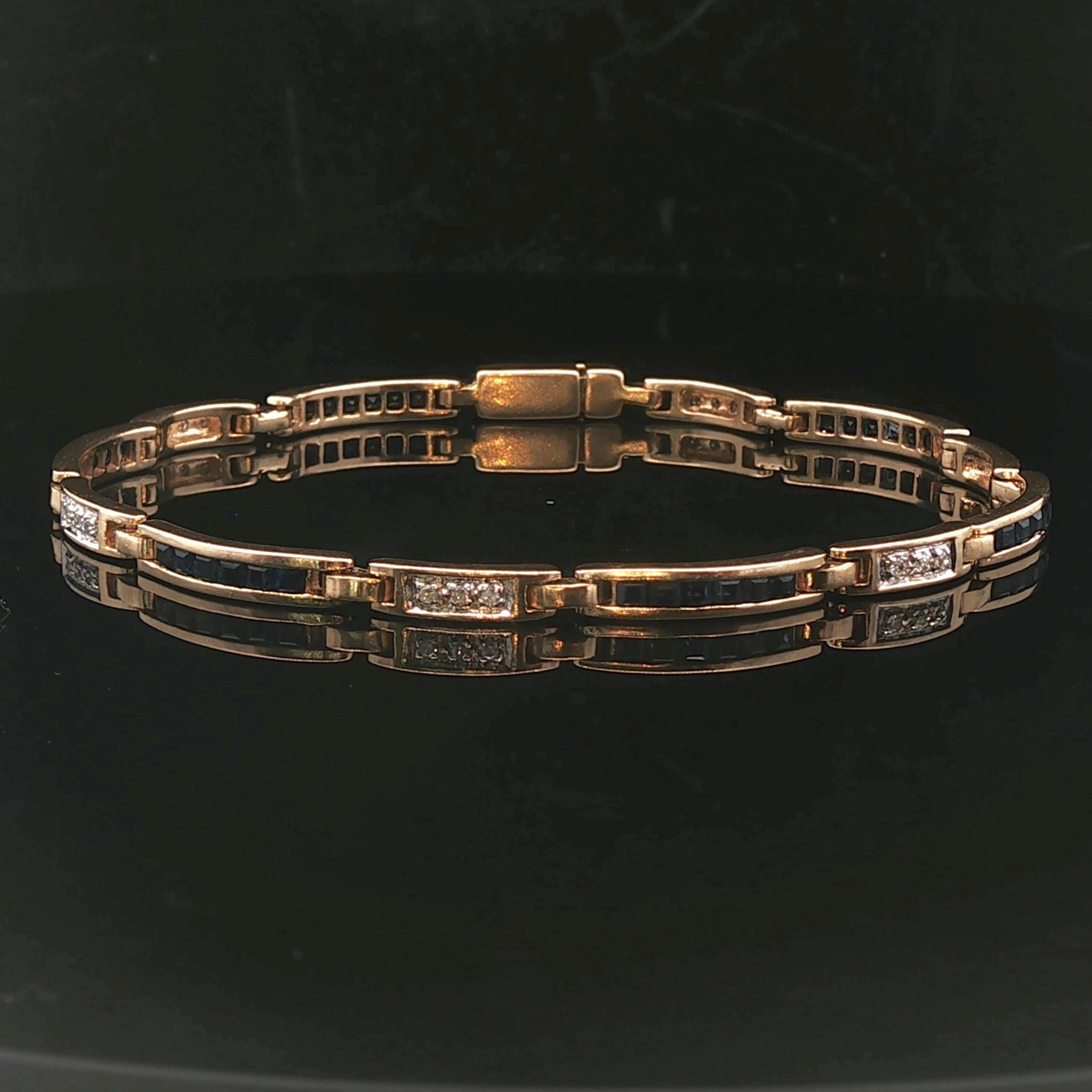 14k Yellow Gold Blue Sapphire and Diamond 10.5g Vintage Bar Link Bracelet 7.25"