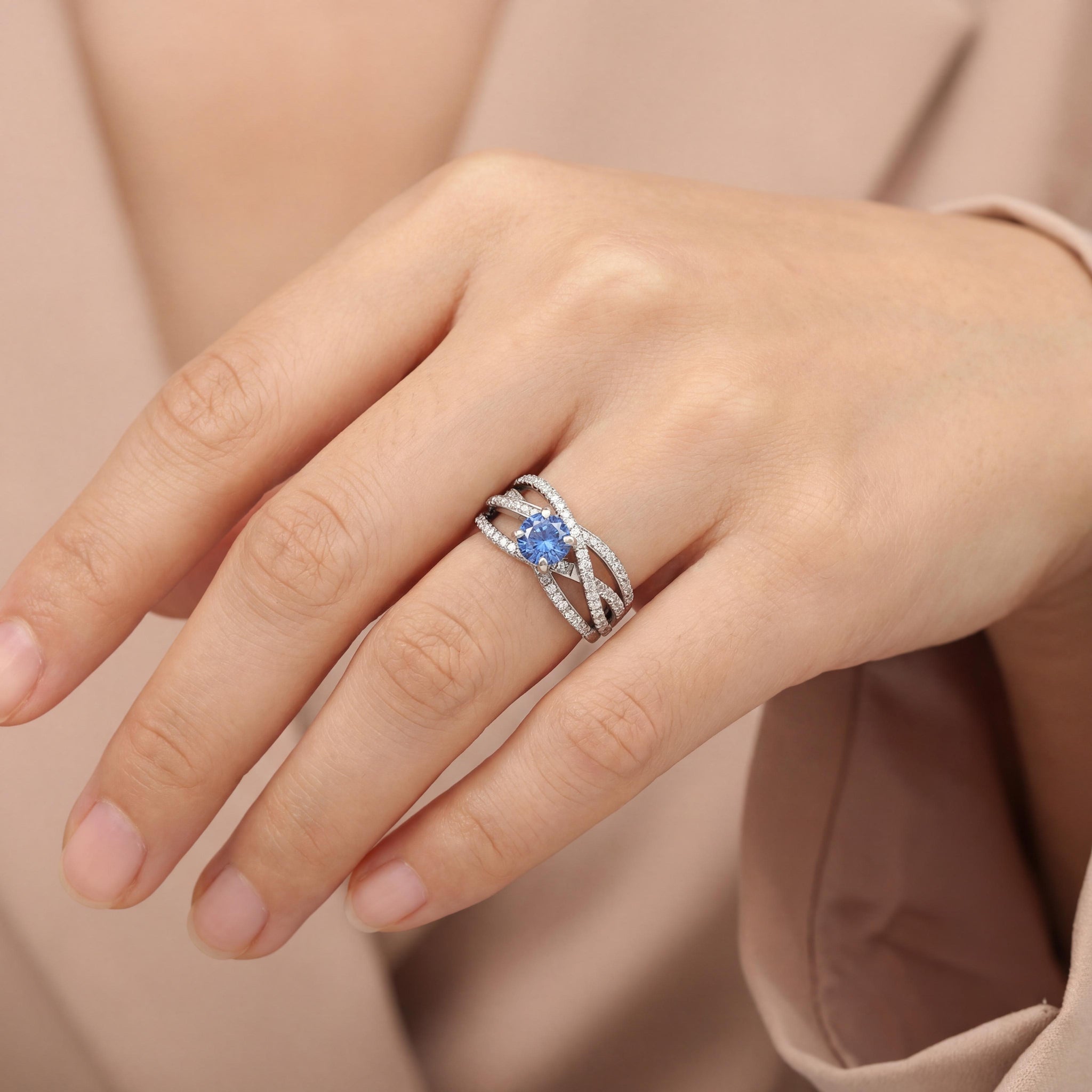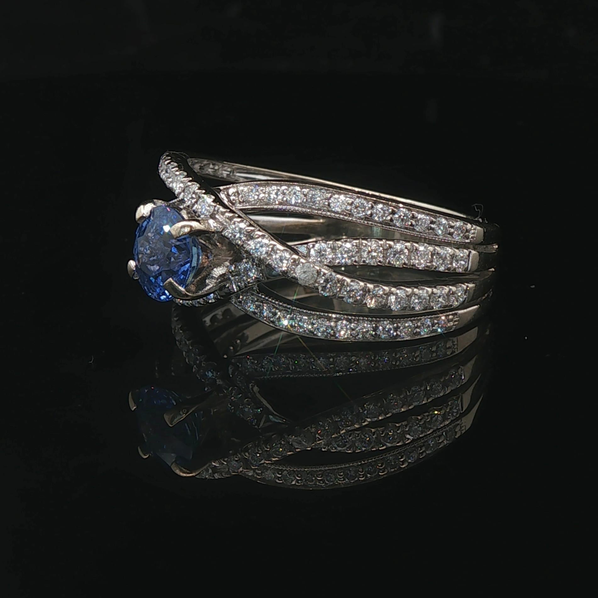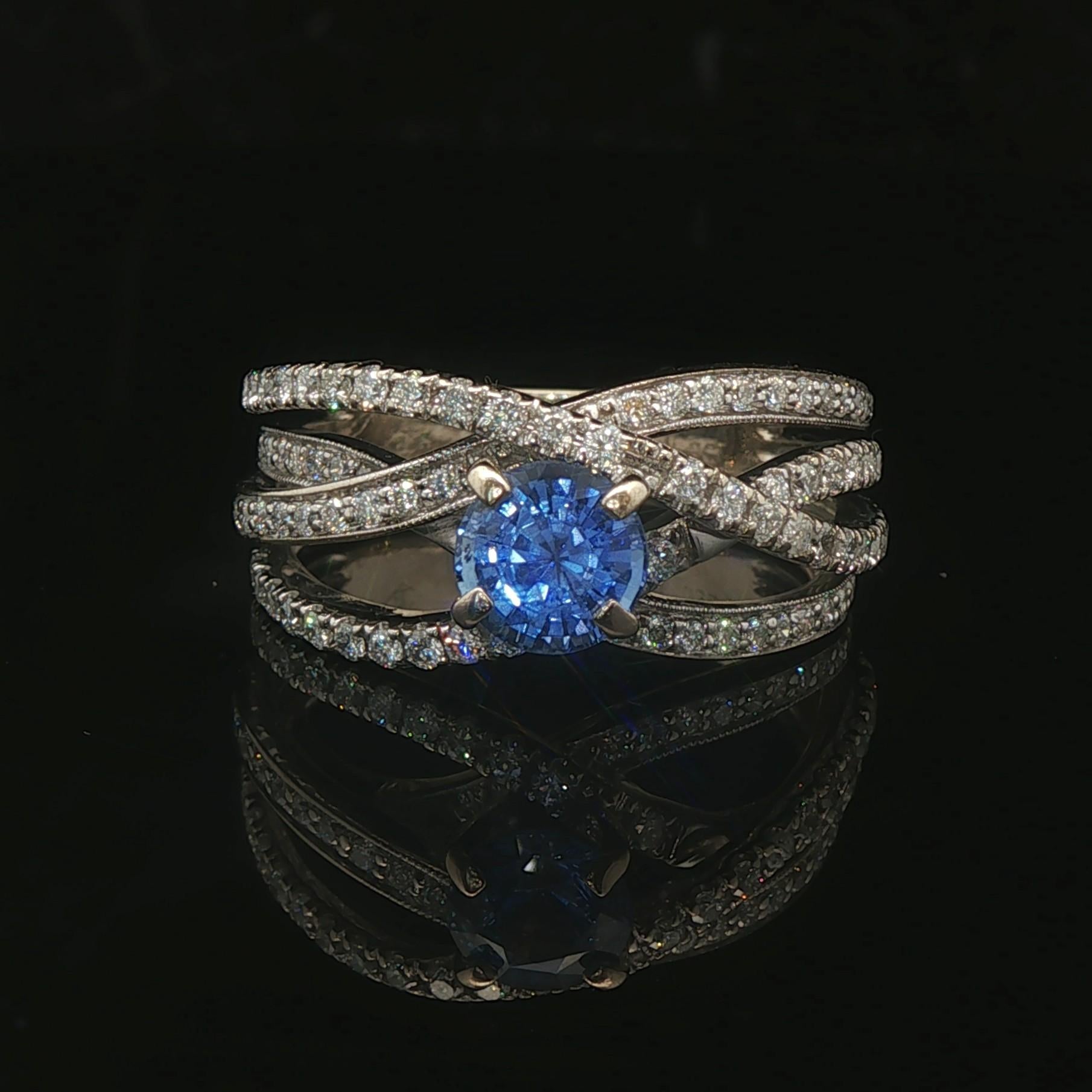 18k White Gold Ceylon Sapphire and 1cttw Diamond Crossover Band Ring Size 8.5