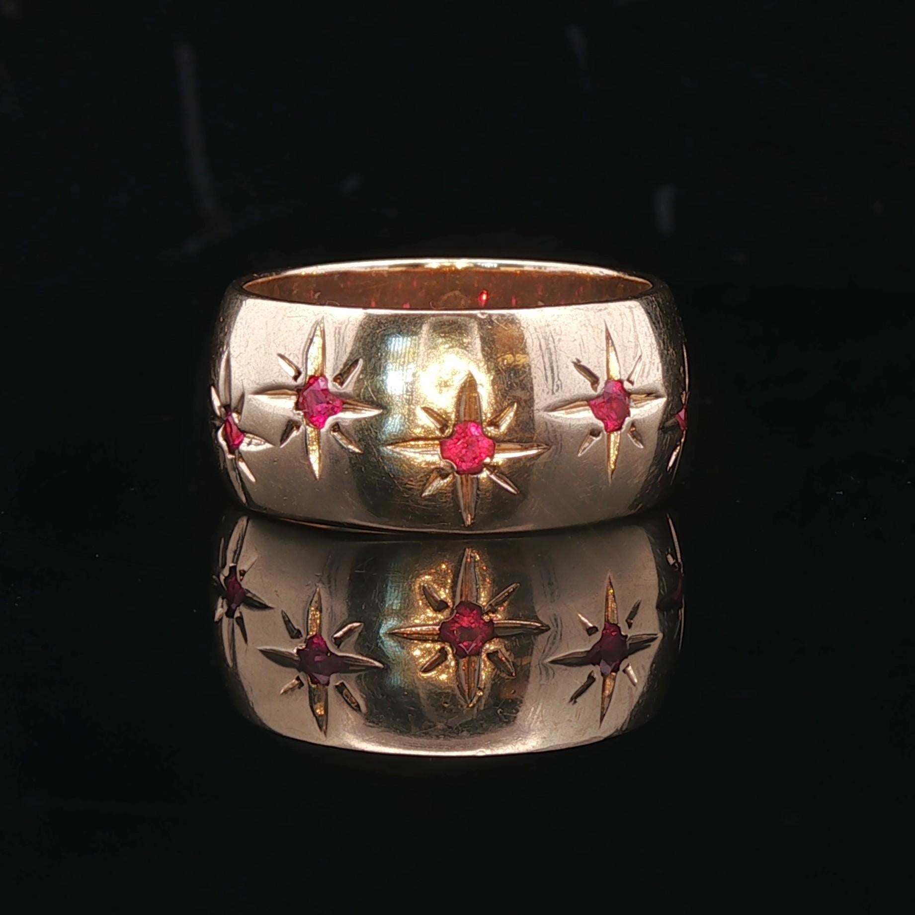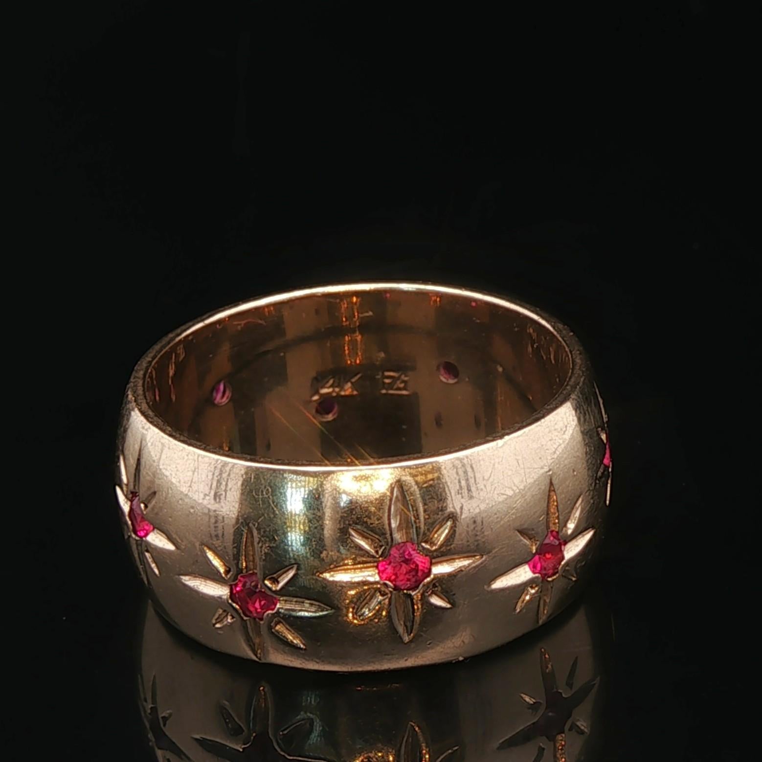 14k Yellow Gold and Gypsy Set Ruby Vintage Starburst Band Ring Size 7.25